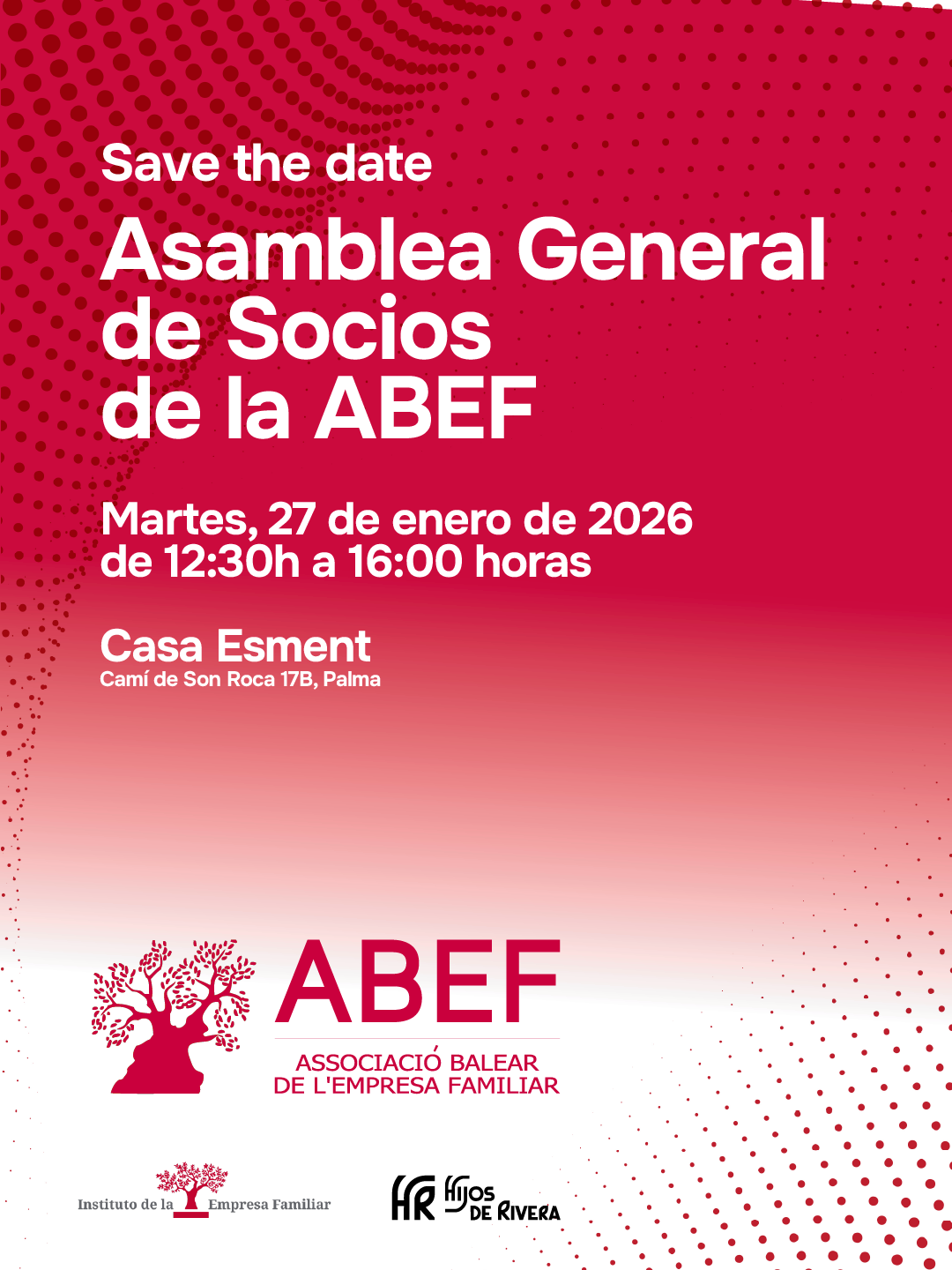El martes, 27 de enero de 2026, tendrá lugar la Asamblea General de la ABEF en Casa Esment. En esta ocasión contaremos con el presidente de la corporación Hijos de Rivera y presidente del Instituto de Empresa Familiar (IEF), Ignacio Rivera.