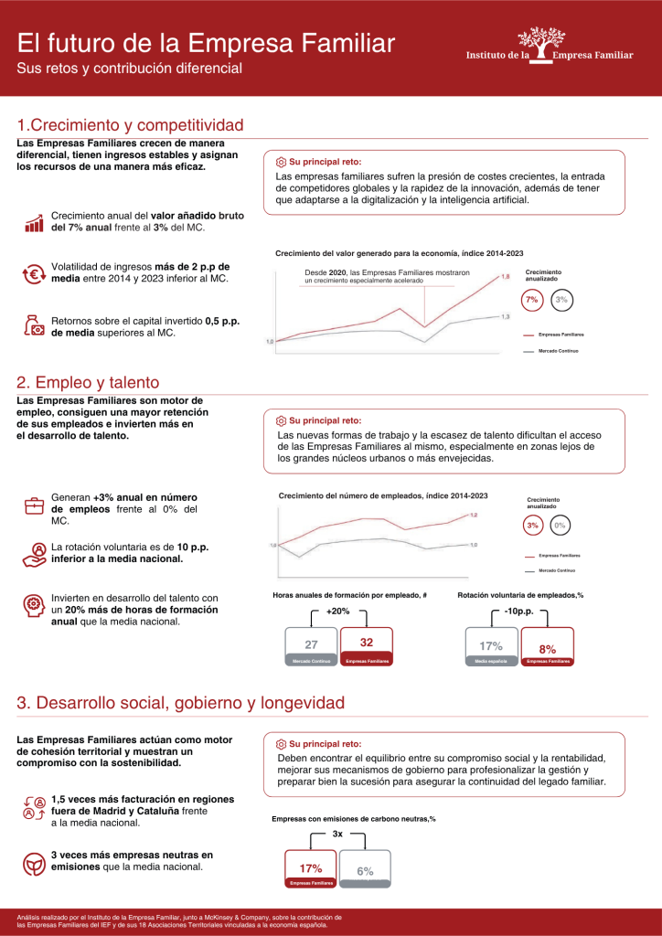 - Según el informe El Futuro de la Empresa Familiar, elaborado por el Instituto de la Empresa Familiar con el análisis técnico de McKinsey & Company, las empresas familiares del IEF crecen 4 puntos porcentuales más y crean 3 puntos porcentuales más de empleo neto que las compañías que cotizan en el Mercado Continuo.
